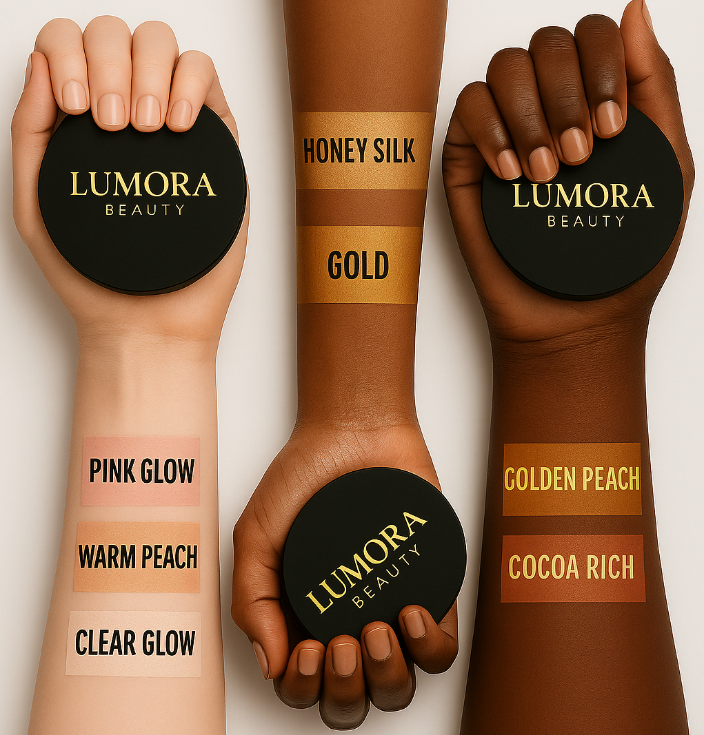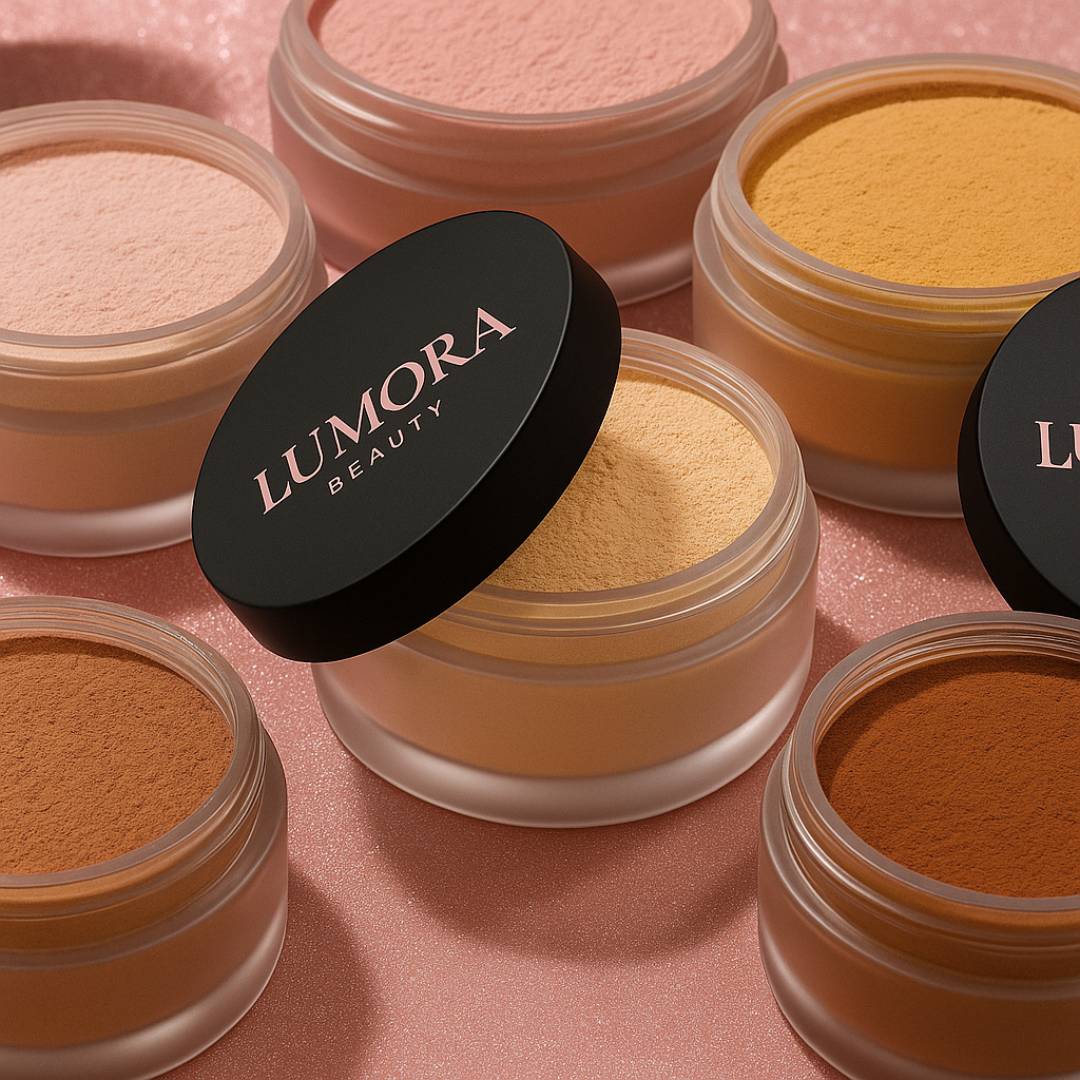 Use a puff or fluffy brush to press LumoraGlow into the skin — especially on areas where you see shine, large pores, or texture. Tap, don’t rub. It melts into the skin and sets in seconds for a seamless, natural finish.